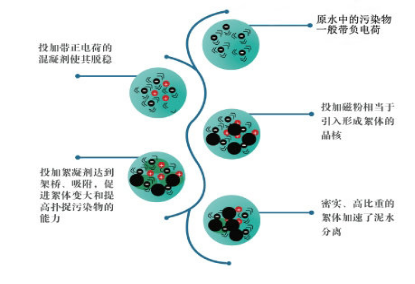 磁混凝沉淀系統(tǒng)是在常規(guī)混凝、絮凝的過(guò)程中,投加水處理配套的磁粉,粉末狀的磁粉與混凝過(guò)程中的絮體結(jié)合,形成以磁粉為凝結(jié)核的穩(wěn)定絮體,由于磁粉的比重是水比重的5.3倍,使結(jié)合有磁粉的絮體比重迅速提高,此種絮體自流進(jìn)沉淀池后,幾分鐘內(nèi)即可實(shí)現(xiàn)快速沉降,沉降速度可達(dá)每小時(shí)40米,是常規(guī)混凝沉淀的20倍,同時(shí)此過(guò)程使混凝絮凝反應(yīng)的架橋、吸附、撲捉能力得到進(jìn)一步提升,強(qiáng)化了處理效果,使磁混凝沉淀系統(tǒng)升級(jí)。