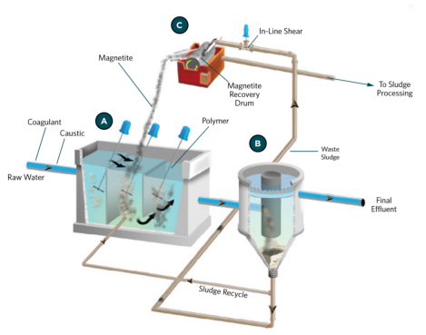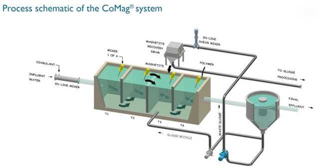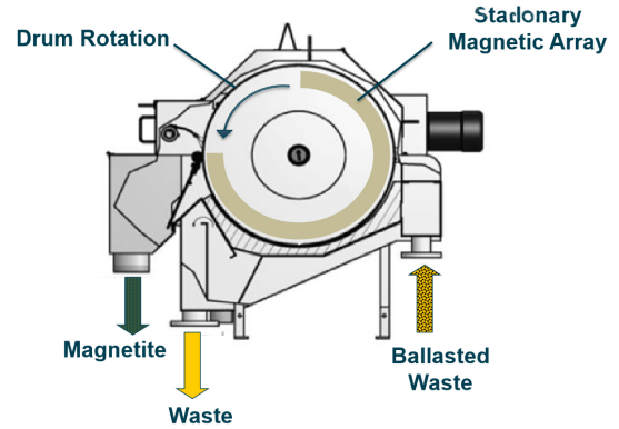 磁種分離在利用過程:形成的絮狀污泥,通過廢污泥管道從沉淀池輸送到在線高速剪切混合器,在那里磁種從絮狀物中分離出來;混合器分離出來的泥漿,隨后通過磁鼓分離器,在分離器滾筒內(nèi)的和固定磁鐵有助于捕獲99%以上的磁種,并將其流回絮凝系統(tǒng)。通過剪切含磁種污泥,分離出磁種,然后污泥進入污泥處理工序。